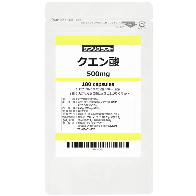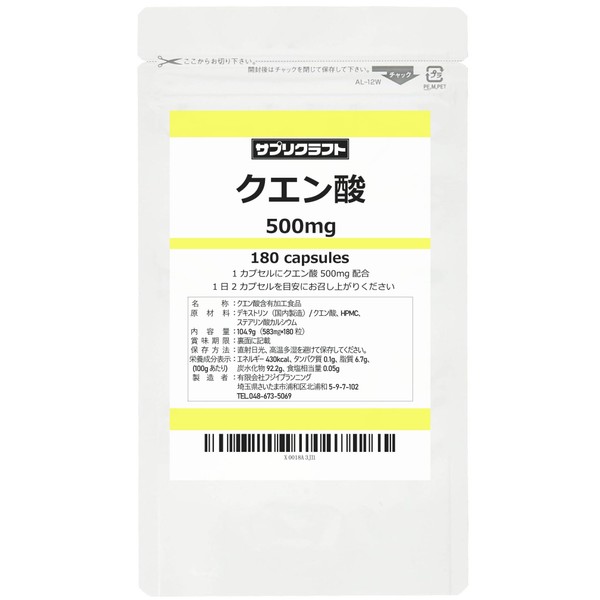 サプリクラフト クエン酸 500mg × 180カプセル 90日分 国内製造 サプリ 【薬剤師監修】