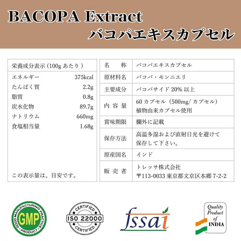 - ✅ インド産ハーブであるバコパ・モンニエリを高濃度抽出により、有効成分バコパサイドが20%以上と豊富に含まれています。