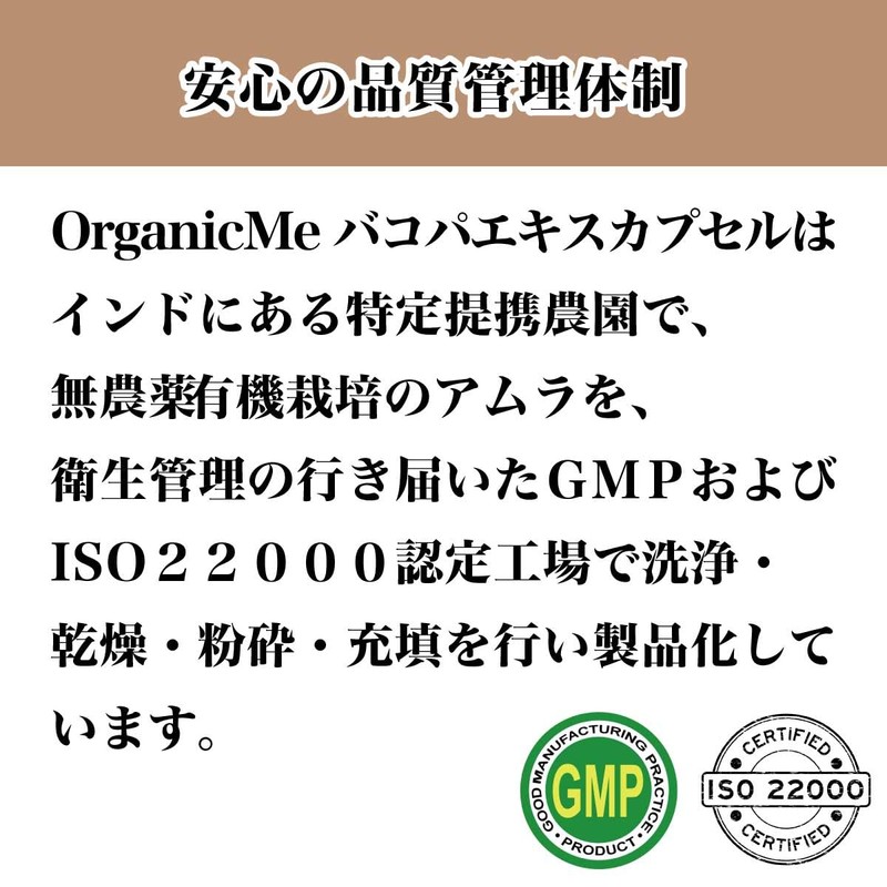 - ✅ Organic Me バコパは、インドの提携農園で無農薬・有機栽培されたバコパ・モンニエリを使用し、GMP認定工場で製造されています。また、ISO22000認証も取得しています。