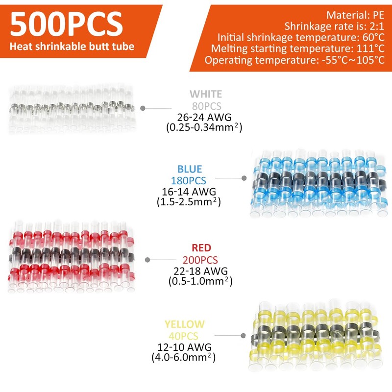 500Pcs Solder Seal Wire Connector Waterproof Heat Shrink Butt Connector Insulated Electrical Wire Terminal Solder Sleeve Solderstick Electric Butt Splice Kit for Marine Automotive