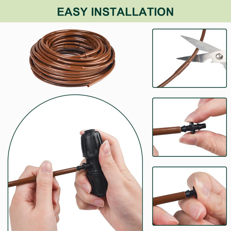 - Easy Installation: Put the tube into a cup of hot water for 10 seconds before assembling. Simply cut the 1/4" tubing into your desired length and connect to barbed Fittings, emitter stream, emitter vortex or misting nozzle. Flexibability allows for tighter turns and fewer elbows for quick and easy installation in gardens, flower beds or other landscaped area