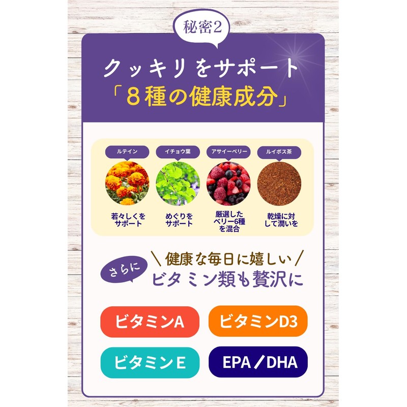 - 【1粒あたりの内容量330mg】 アサイーベリー(20:1)50.0mg イチョウ葉乾燥エキス30.0mg ベリー混合エキス(Optiberry)15.0mg マリーゴールド色素(ルテイン:20%)20.0mg クチナシ色素(クロセチン含有)1.0mg ルイボス茶乾燥エキス10.0mg ビタミンA(9%)2.0mg ビタミンD3 (0.5%)0.5mg ビタミンE (67%)3.0mg 精製魚油(EPA 15.3%、DHA 10.2%)171.5mg 賦形剤27.0 mg