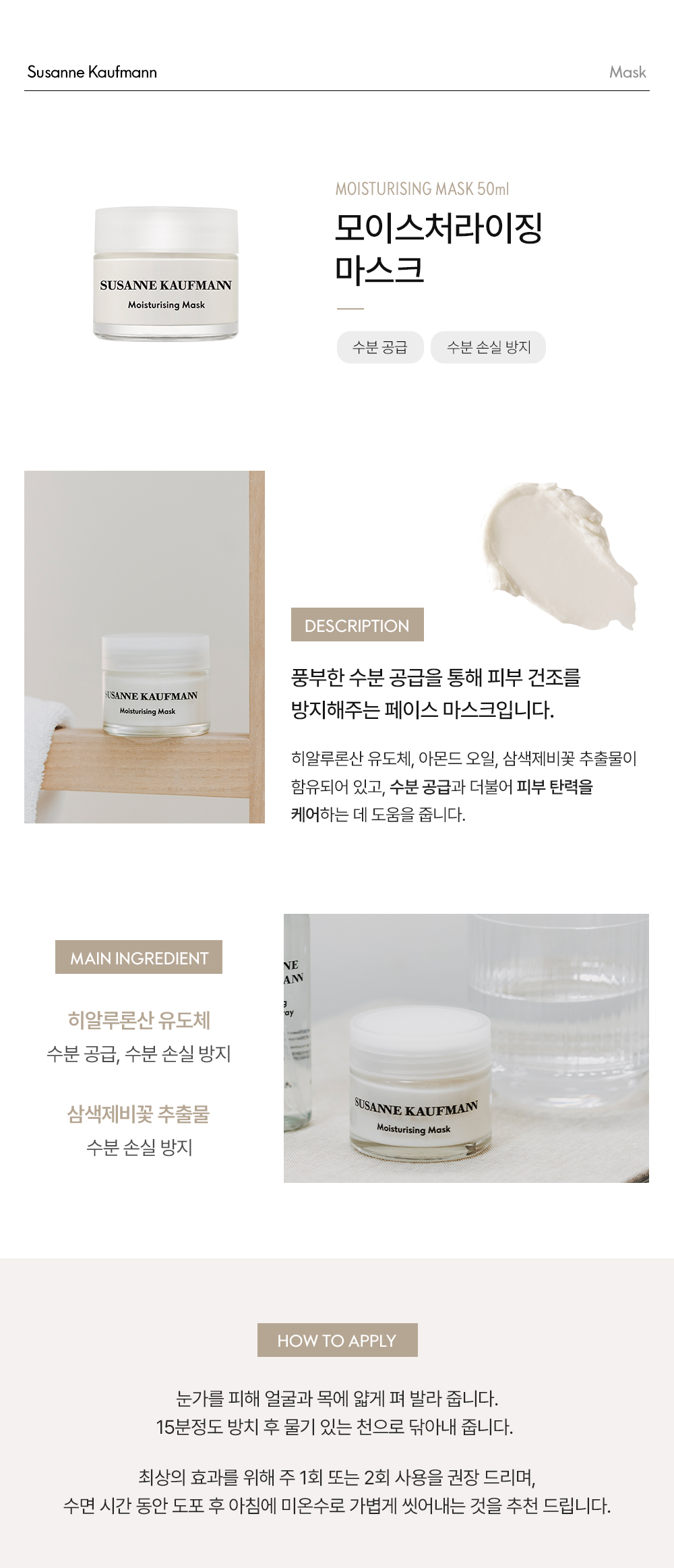 | 사용방법 | 눈가를 피해 얼굴과 목에 얇게 펴 발라 줍니다. 15분정도 방치 후 물기 있는 천으로 닦아내 줍니다.최상의 효과를 위해 주 1회 또는 2회 사용을 권장 드리며, 수면 시간 동안 도포 후 아침에 미온수로 가볍게 씻어내는 것을 추천 드립니다.? |