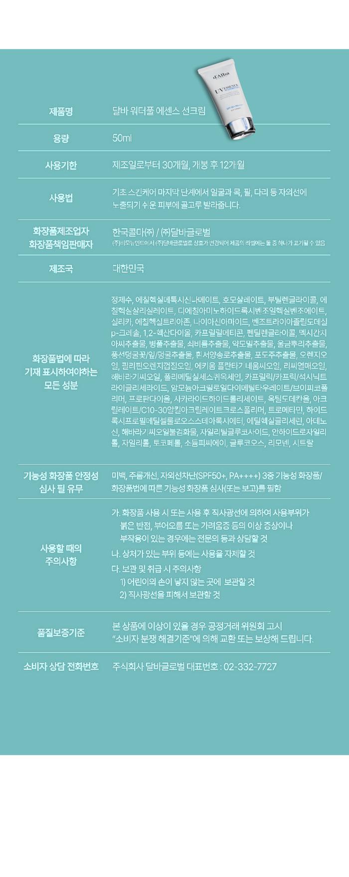 달바 워터풀 에센스 톤업 선크림 수분썬크림 50ml x 1개