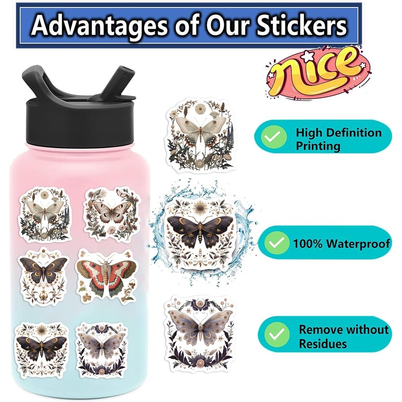 50pcs Aesthetic Stickers Cute Cartoon Moon Moth Stickers, Nature Insect Waterproof Vinyl Stickers Pack for Bumper, Laptop, Skateboard, Luggage, Phone,Bicycle (Moth)