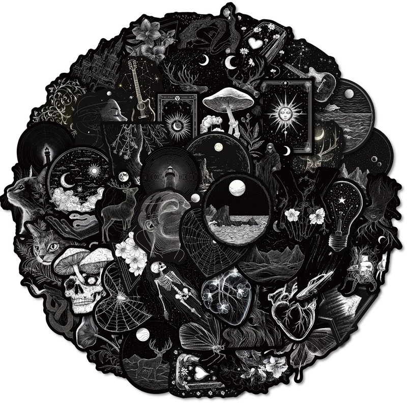 - Trendy Design Stickers Pack: 50 unique black aesthetic stickers featuring sleek and designs, perfect for scrapbooks, laptops, phone cases, and travel accessories