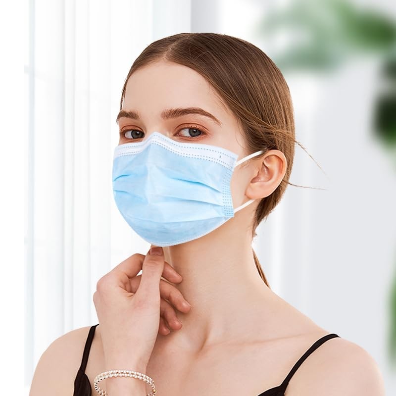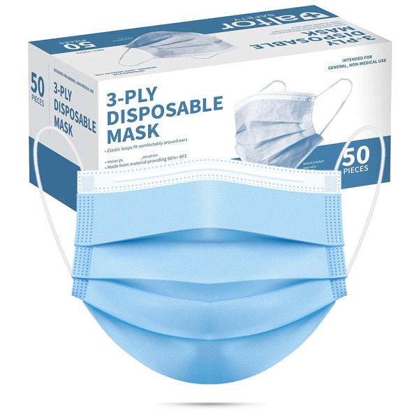 50pcs Blue Disposable Face Mask for Adults Women Men, 3-Ply Solid Blue Breathable Earloop Full Face Protection
