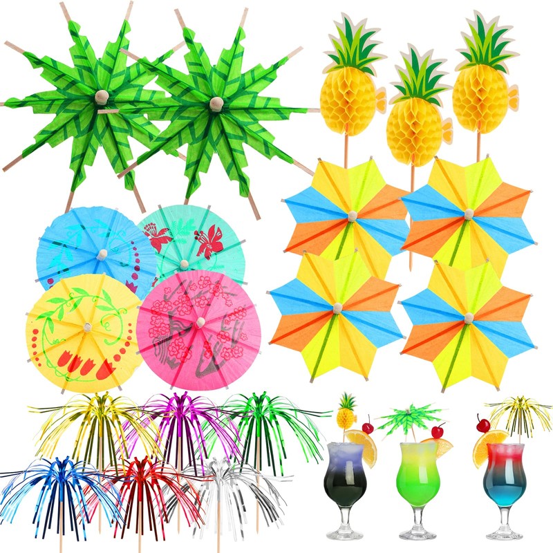- Product Overview & Included Components This tropical-themed set includes 50PCS cocktail umbrellas for drinks (5 vibrant styles) and 50PCS umbrella toothpicks (40 palm tree & 10 pineapple designs). Perfect for garnishing cocktails, fruit platters, or as umbrella cupcake toppers. The drink umbrellas measure 2" when open, while the paper umbrellas umbrella cupcake toppers fold neatly for storage