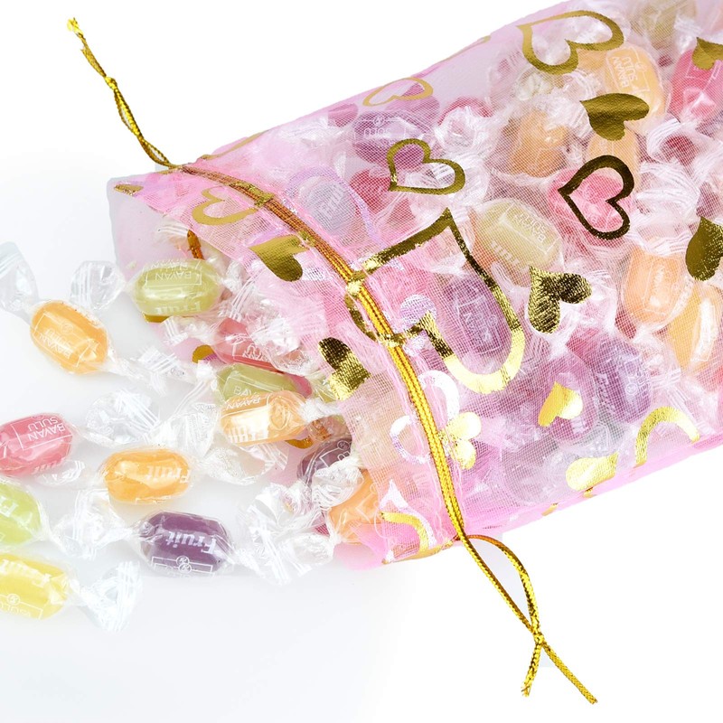 - MATERIAL:Made of high quality sheer organza and satin drawstring, the pink bag is printed with a golden love heart, which is very beautiful.