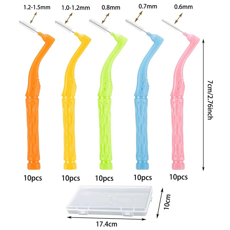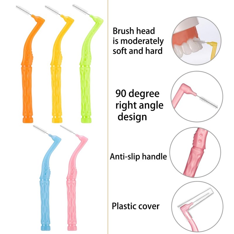 - 【5 sizes available】The interdental brush bristles Dense Fine,efficiently cleans tartar without hurting gums, equipped with dust cap, clean and hygienic, and the non-slip handle is thoughtfully designed to prevent slipping. Various colours and sizes: pink (0.6mm), blue (0.7mm), green (0.8mm), yellow (1.0-1.2mm), orange (1.2-1.5mm), you can choose the size according to the gap between your teeth for use.