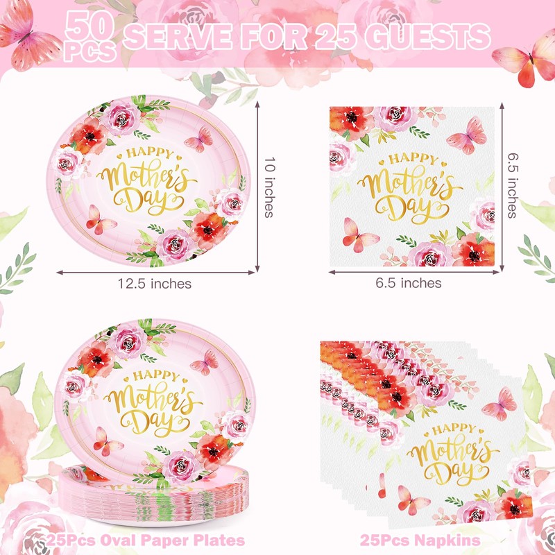 - Serve For 25 Guests: Our Mother's Day paper plates and napkins heavy duty contains 25 set mothers day tableware serving for 25 guests, including 25Pcs 10*12.5 inch oval paper plates and 25Pcs 6.5" napkins, it is 13*13 inch when unfolded. You can use them to hold different food from appetizers to main courses, such as sandwiches, salads, desserts, snacks or other party foods. This dinnerware set is a great way to start a Mother's Day party