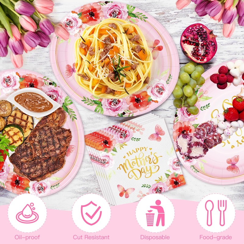 - Versatile Usage: The plates and napkins party supplies are designed for Mother's Day-themed parties, which is versatile and the ultimate choice for a variety of themed parties, providing a wide array of delectable party food. Suitable for daily use as dinners, Mothers Day party, spring party, picnics, celebration. Have a happy holiday decorating with our party supplies, creating a celebratory atmosphere for Happy Mother's Day with your friends and family