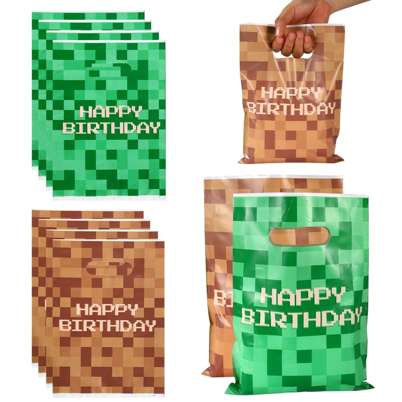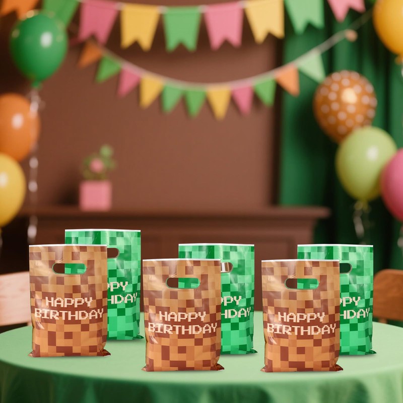 - Product Content: 50 pixel themed birthday gift bags. Front in green, back in brown, with "Happy Birthday" in pixel style. Perfect for birthday party favors.