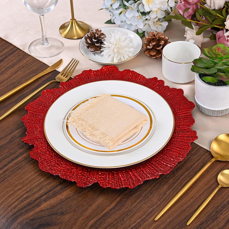 - 🍥What You Will Get: you will receive 50 reef Red charger plates (13"/33cm diameter), offering ample quantity for everyday use, replacements, and entertaining needs, which can serve 50 people at a time. The charger plates bulk feature a stunning reef rim that adds a touch of elegance and sophistication to any table setting.