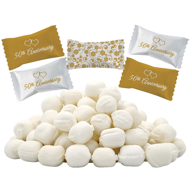 50th Anniversary Buttermints! Are Perfect for a Candy Tray Buffet or When Serving Coffee. The Great Taste of Butter Mint Will Bring You Back to Your Childhood! A Sweet addition to your Celebration supplies, choose this candy treat for a great party favor, Great for Parades and Parties, add as a sweet addition to candy offerings. Perfect party size packaging - Choose Between 55, 110, or 330 Buttermints Per Bag. Gluten Free, Fat-Free, Kosher and No Trans Fat. Proudly Made in the USA! Delicious Smooth & Creamy Butter Mints, Individually Wrapped for any Celebration. Great for any your Themed Celebration, Party or Event!