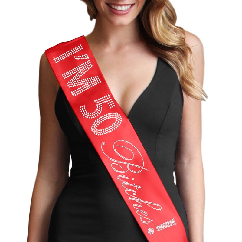 50th Birthday Decorations - Crystal Rhinestone I'm 50 Bitches! Premium Satin Sash - 50th Birthday Gifts for Women - Red