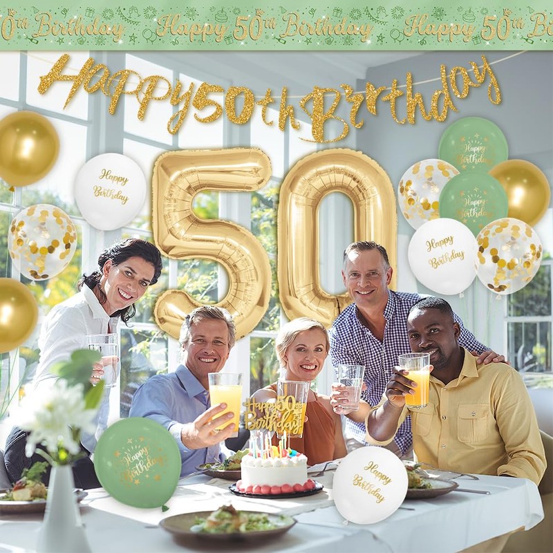 - 50TH Birthday Decorations Sage Green – The 50th birthday decorations include 9ft sage green happy 50th birthday banner, glitter Happy 50th Birthday banner, 32In “number 50” foil balloons, 12 pack Happy Birthday printed balloons, happy 50th cake topper, ribbon.