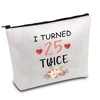 - Bag with Words: I TURNED 25 TWICE. Funny cosmetic makeup bag for women turning 50 to celebrate birthday 50th woman. Ideal birthday gifts choice for your wife, mother, grandma, aunt, sister, girlfriend, best friends.
