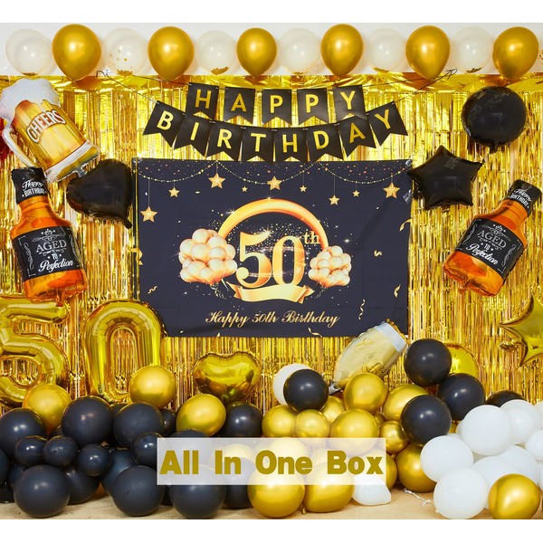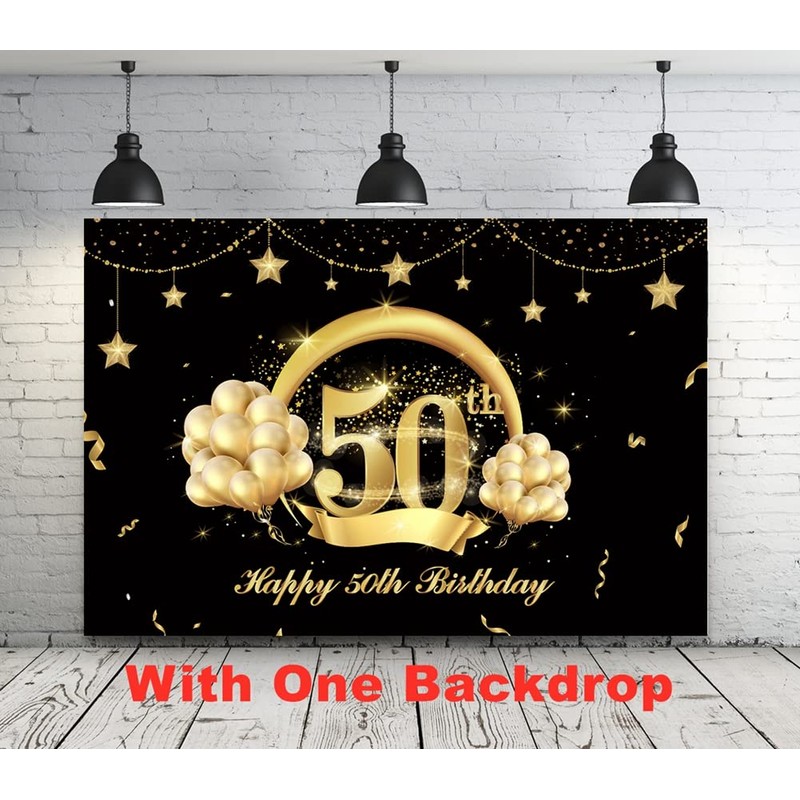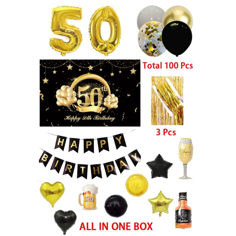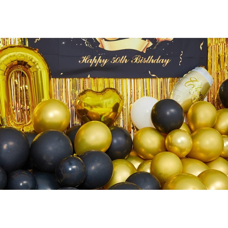- 50TH BIRTHDAY PARTY DECORATIONS INCLUDED: 1 pcs 50th birthday backdrop; 1 pcs happy birthday banner; 3 pcs gold metallic fringe curtain /3 ft(w) x 6.6 ft(h); 1 pcs gold '50' foil balloon; 10 pcs different kinds of foil balloons as picture shows; 100 pcs latex balloons; 1 pcs balloon arch; 1 pcs pump; 3 pcs balloon glues, total 121 pack of 50th birthday party decorations