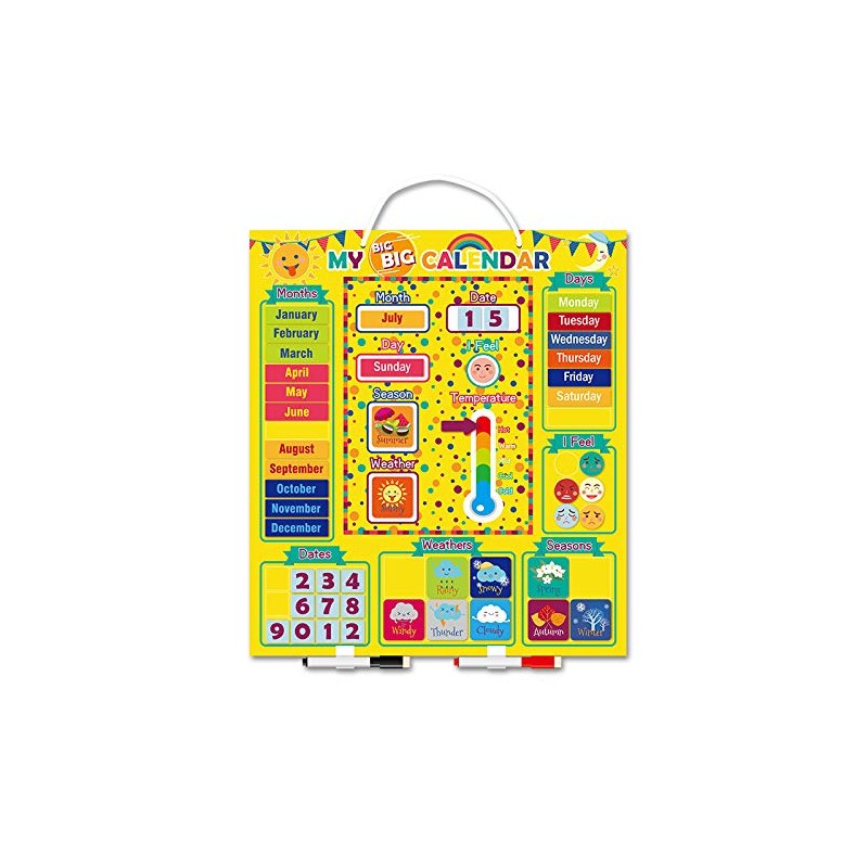 - Magnetic Calendar for Kids: This daily learning calendar has 48 magnetic parts in total, including days of the week, dates, years, 12 months, 6 weather types, 4 seasons, 12 numbers, and 6 emotion magnets to help kids express feelings. It also comes with 2 dry-erase markers.This kids calendar for 3+ years help kids easily grasp the concept of time. There are enough numbers to keep kids using it for years. Rich colors and content keep your kids interested while using it!