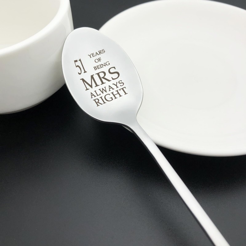 - 51 YEAR ANNIVERSARY GIFTS FOR COUPLES: Engraved as “51 Years of Being Mr Right” “51 Years of Being Mrs Always Right”. 51 years of marriage requires lots of love, patience, devotion, and teamwork! this spoon is the perfect expression of a happy 51th wedding anniversary.