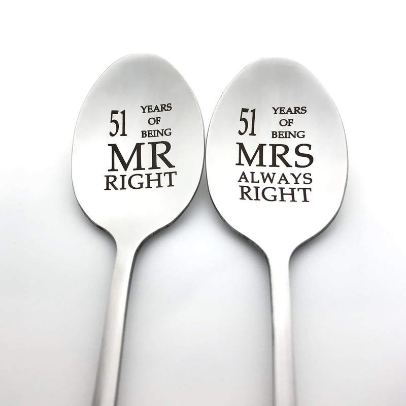- WHAT YOU GET: 1 x 51 Years of Being Mr Right Spoon,1 x 51 Years of Being Mrs Always Right Spoon. If you are not completely satisfied with your purchase, Just contact us, We will solve your problem within 24 hours.