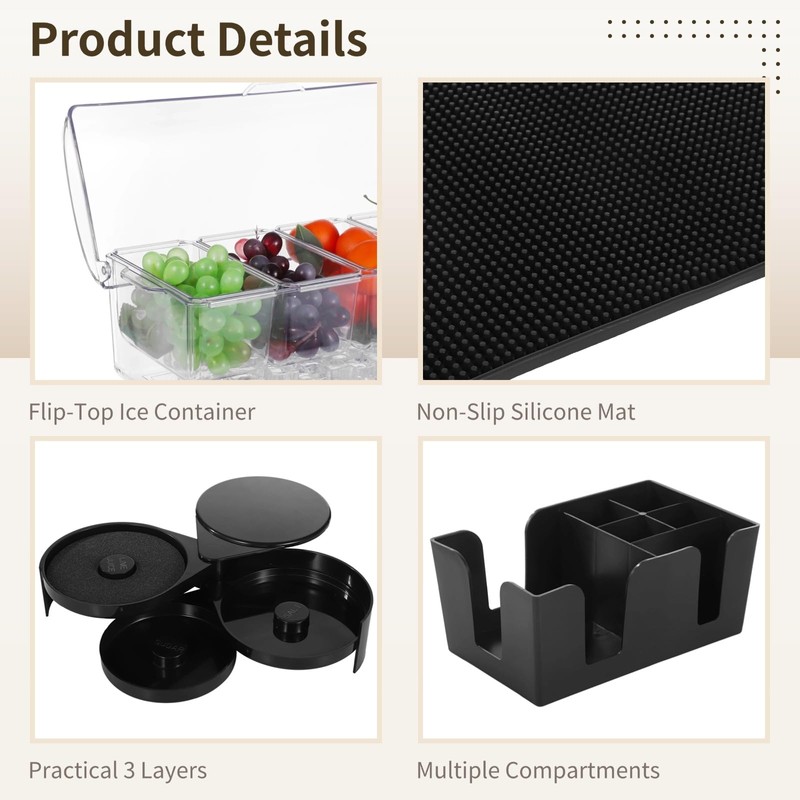 515 PCS Garnish Tray Bartending Supplies, Ice Tray with Lid Bar Caddy 3 Tier Glass Rimmer, Mobile Bar Set with Non-Slip Silicone Bar Mat, Juice Jugs with Spouts, 500 Straws, Bottle Pourers