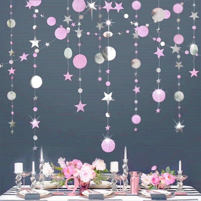 52 ft Hanging Paper Garland Glitter Pink Silver, Round and Star Paper Decoration for Party (4 m x 4)