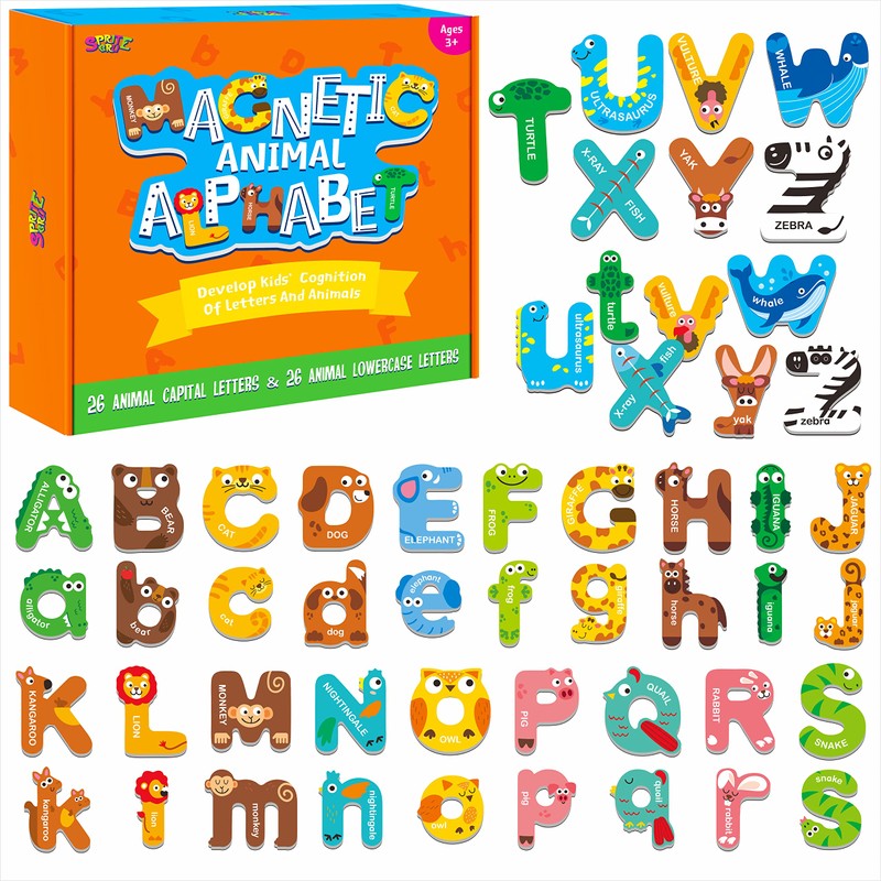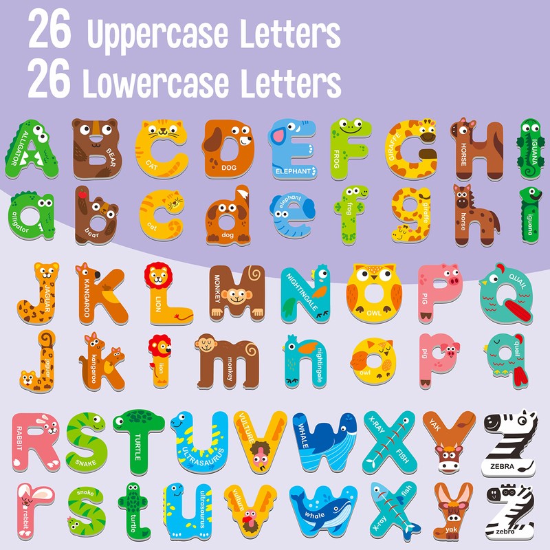 - UNIQUE DESIGN: 52 large magnetic letters with vivid animals on each representing the letter, like A for alligator, a very cute set of alphabet learning toys. It arouses children’s interest greatly, making kids learn the alphabet as well as animals.