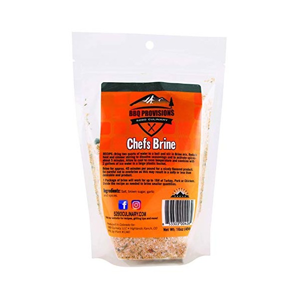 - Brand Name: 5280 Culinary Flavor: Blend of Sugar, Salt, Spices and Herbs Product Type: Brine Mix Container Size: 16 oz. Packaging Type: Bagged Number of Servings per Package: 1 Size Class: 1 Sub Brand: BBQ Provisions