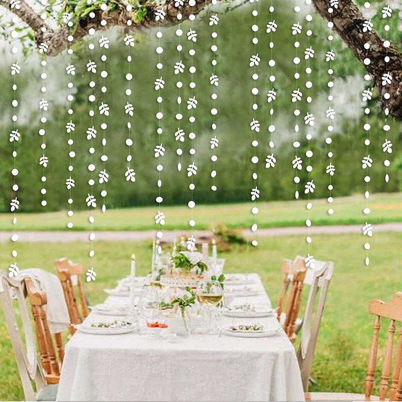 - 🤍【Unique Design】 This white circle dot leaves garland party streamer are made of pearl paper. Perfect for party decorations to create magical festive atmosphere for your family and friends.