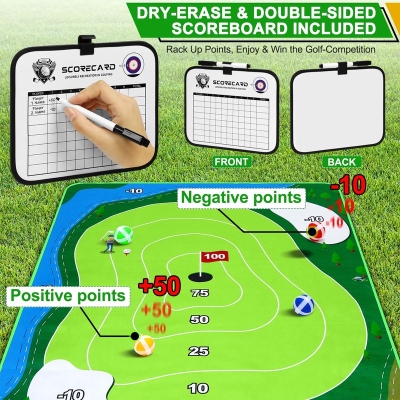 - Competitive Fun: You aim for the green, fairway, and pin, players aim their chips to land and stick onto the labeled scoring zones to rack up the most points and win, just watch out for the hazard zones. Hang the golf chipping game mat on the wall or lay it on the ground; indoor or outdoor, bring the competitive fun to everyone of your parties and family gatherings!