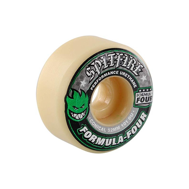 - One (1) set of Spitfire Wheels Formula Four Conical White w/ Green & Black Skateboard Wheels - 101a; includes four (4) wheels