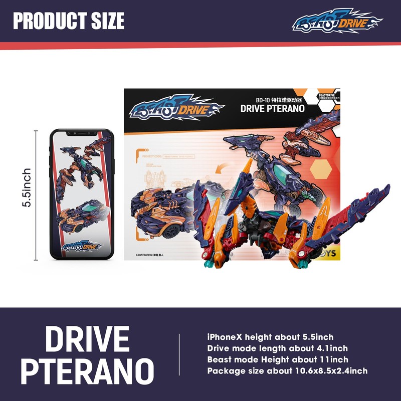 52TOYS BEASTDRIVE BD-10 DRIVE PTERANO, Assemble Robot, Converting in Pterosaur and Racing Car, Action Figure, Collectible Gift 52TOYS (pronounced five two). Beyond Joys. ?Dual Shape of Drive and Beast Mode ?The skeleton of the product is the finished product, the shell is assembled panels, and it needs to be assembled on the skeleton by yourself. It can realize the transformation between drive mode and beast mode no matter before or after assembly. The whole body has fully adjustable joints, allowing to display in a variety of poses.