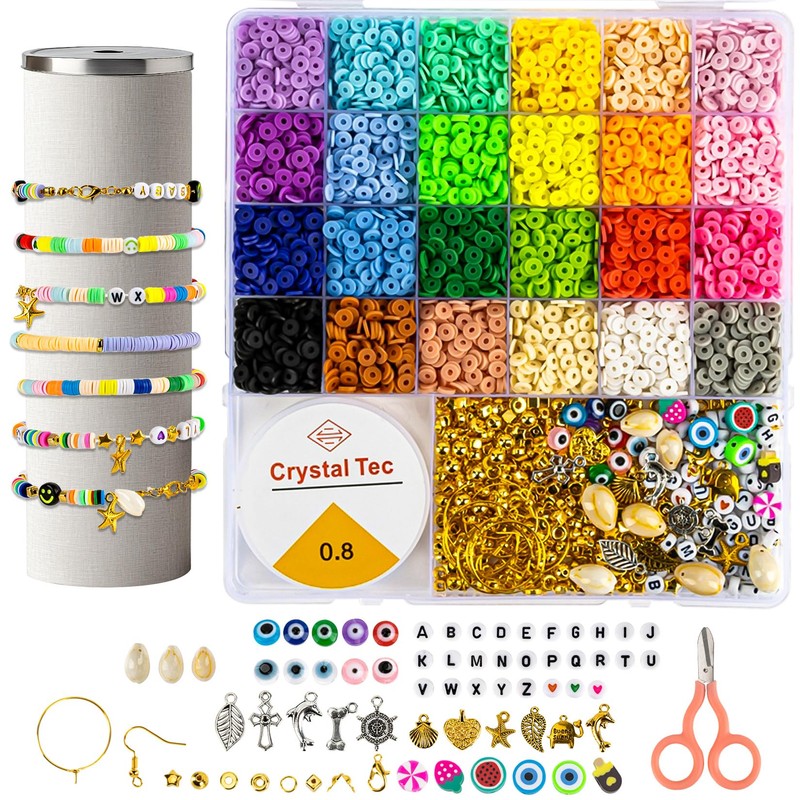 - Perfect Bracelet Making Kit: Unleash your creativity with 5300 premium clay beads in 24 vibrant colors and other charms kit(contains random letter beads,shells,lobster clasp,pendants), 1 roll elastic strings,a scissors,The bracelet kit perfect for crafting unique accessories. Ideal for DIY lovers, crafters, and beginners alike