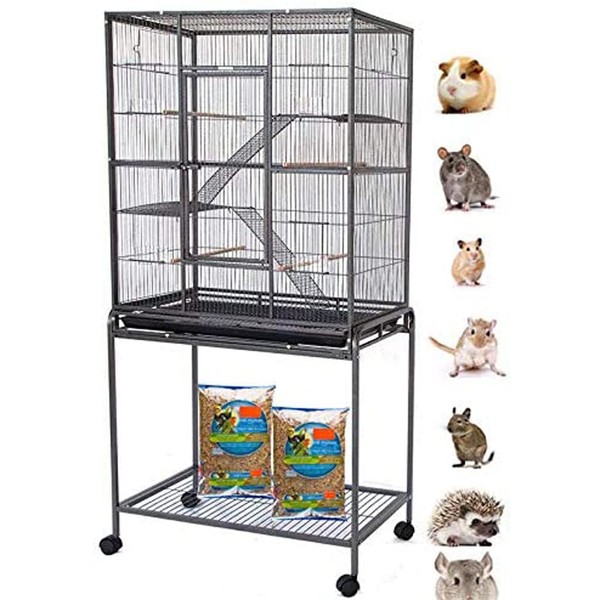 64" Extra Large Wrought Iron Chew Proof 4-Levels Ferret Chinchilla Sugar Glider Mice Rat Mouse Hamster Cage Narrow 1/2-Inch Bar Spacing Easy Clean Pull Out Tray with Detachable Rolling Stand