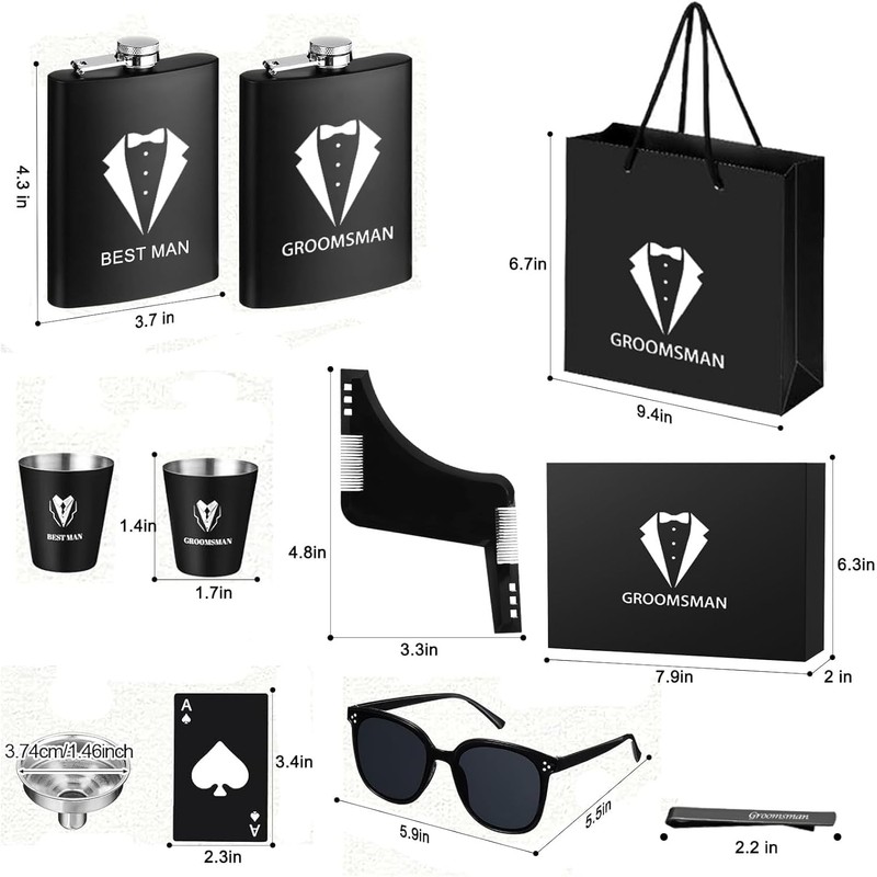 - Practical Gift Set:the package contains 54 pieces of groomsmen gifts for wedding, including 6 pieces of groomsmen gift proposal bags, 6 Gift Boxes , 6 Flask 6 Tie Clips, 6 wine cup6 Funnel 6 Bottle Opener 6 pieces of sunglasses 6 Beard Styling Comb