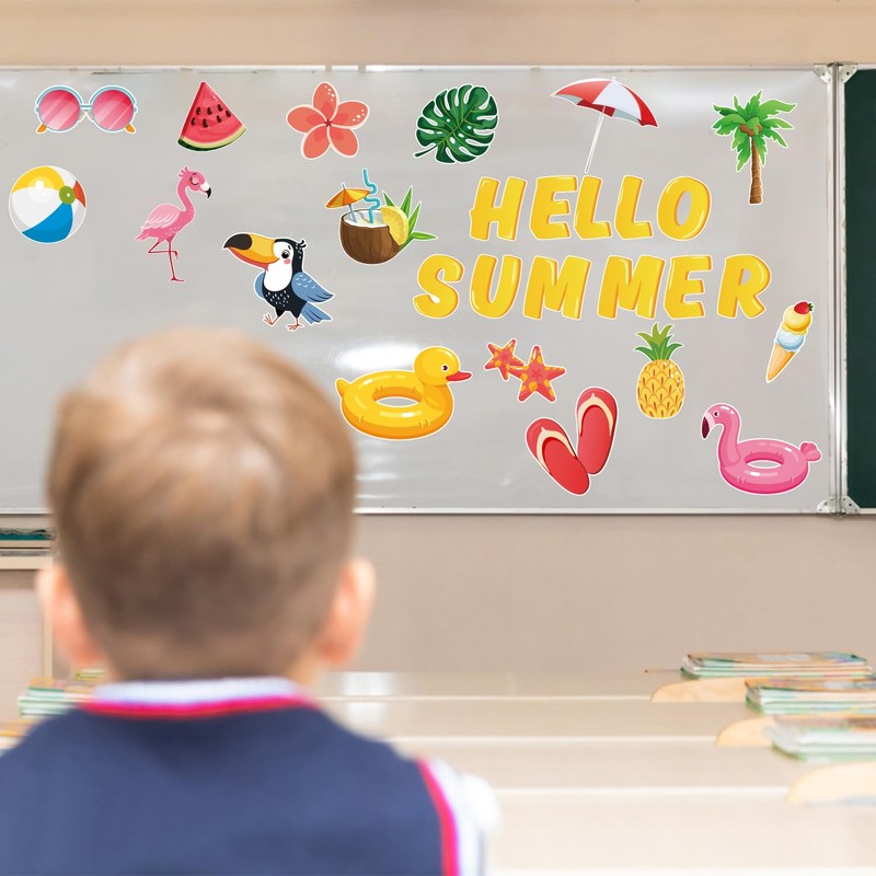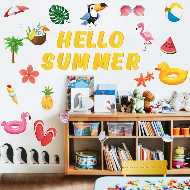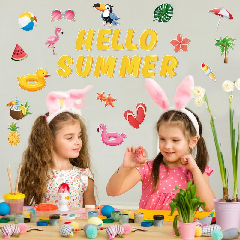 54pcs Summer Bulletin Board Decorations, Reusable Hello Summer Cutouts for Bulletin Board with Dot Glues Classroom Cut Outs Decorations in Different Patterns Summer Vibe