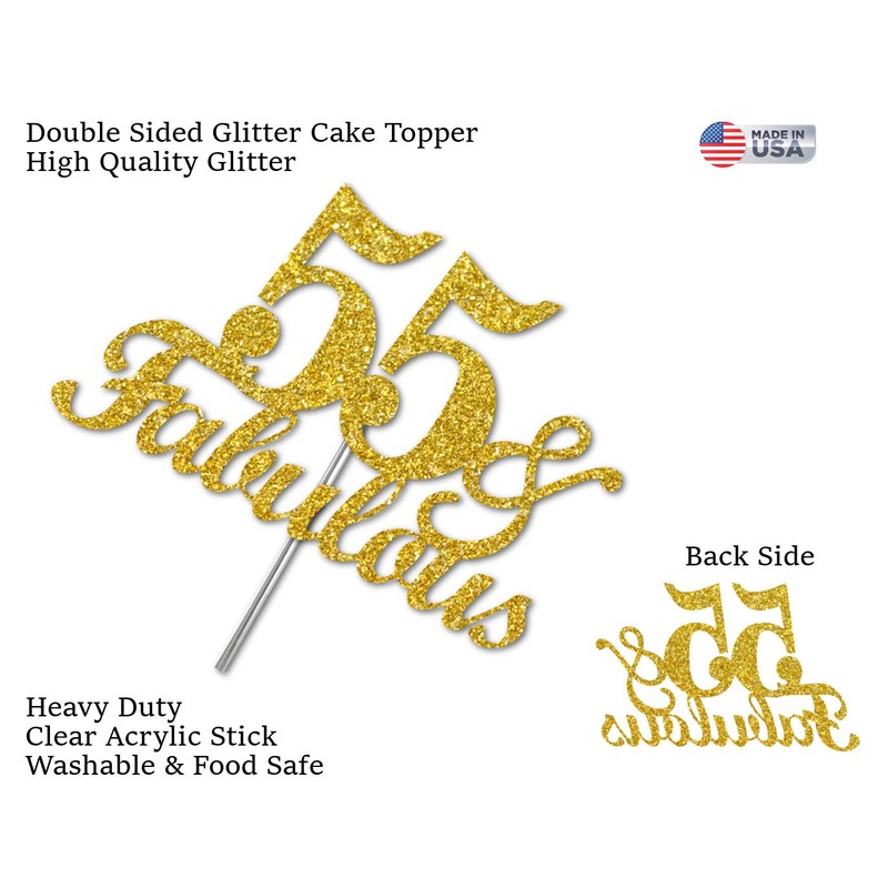55 & Fabulous Decoración para tartas con purpurina dorada, ideas de decoración para fiestas de cumpleaños 55, calidad premium, resistente purpurina de doble cara, palo de acrílico. Fabricado en Estados Unidos (55)
