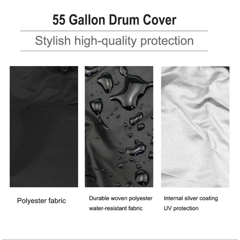 - Waterproof Material: The drum lid cover made of heavy duty polyester fabric with UV silver coating which has better sun protection performance, waterproof and sturdy fabric provide long service life