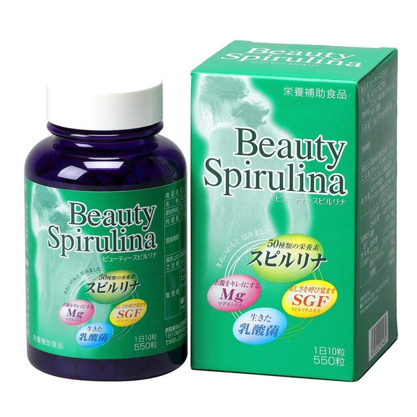 Beauty Spirulina Approximately 550 Tablets are formulated with spirulina, SGF, lactic acid bacteria and magnesium, to support your stomach. Help maintain your health and beauty. Directions for consumption: Take 10 tablets per day with cold or hot water. Storage Instructions: Store in a cool place as possible away from high temperatures, high humidity, and direct sunlight. Spirulina Spirulina is a type of indigo algae, meaning "spiral" and "twisting". Spirulina is a major feature of breeding in harsh environments such as high temperature, high alkali, and high salt. Spirulina is only 33-35% soybeans known for its high protein content and good quality food with high protein content only 33-35%. Spirulina is also rich in vitamins and minerals. ■ Breakdown ⇒ Contents Volume: 110 g (200 mg x 550 tablets); Day Quantity (estimate): 10 seeds ■About 55 days supply; Size (exterior): Height 4.7 x Width 2.6 x Depth 2.6 inches (120 x 65 x 65 mm)