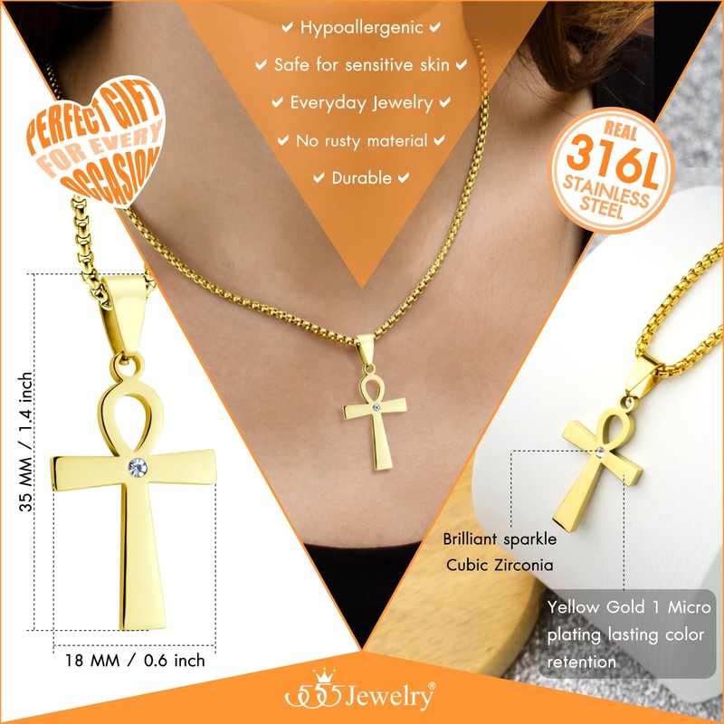 555Jewelry - Collar de Ankh egipcio de 1 mm para hombre, circonita cúbica para mujer, joyería egipcia para mujer, cruz copta, collar egipcio antiguo para mujer, 16-24 pulgadas, 22", Acero inoxidable