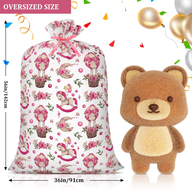 - 1. Extra Large & Spacious – This 56" jumbo gift bag is perfect for oversized presents, party favors, or surprise gifts. Fits large toys, stuffed animals, baby shower essentials, and more with plenty of room to spare!