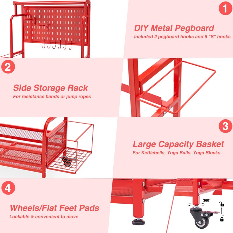 56'' Taller Home Gym Storage Organizer, Yoga Mat Storage Rack with Hanging Board, Exercise Workout Equipment Storage Stand for Home Gym, Dumbbell Holder Kettlebell Rack with Wheels and Hooks (Red)