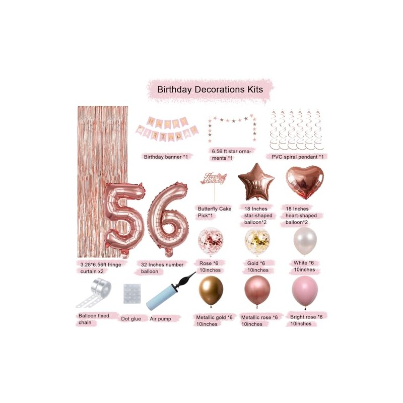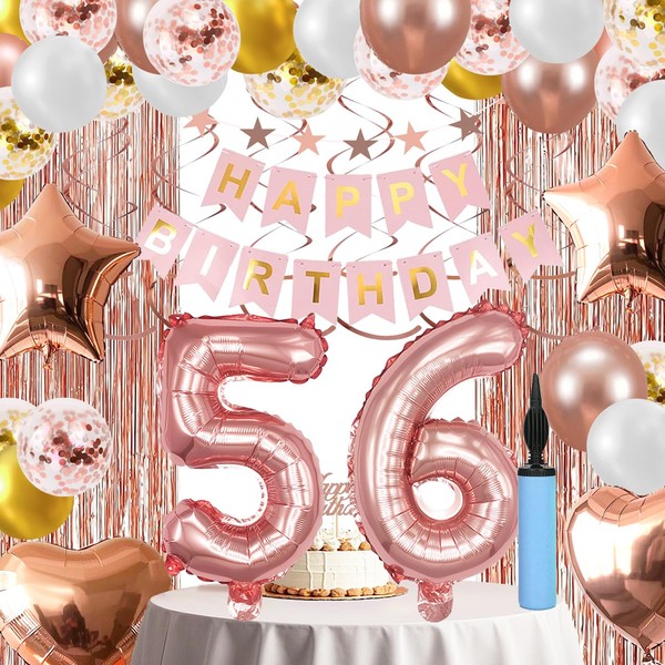 56th Birthday Decorations For Women, Happy Birthday Banners Party Decor Foil Fringe Curtains Heart Star Confetti Balloons, Hanging Swirls Party Supplier Rose Gold