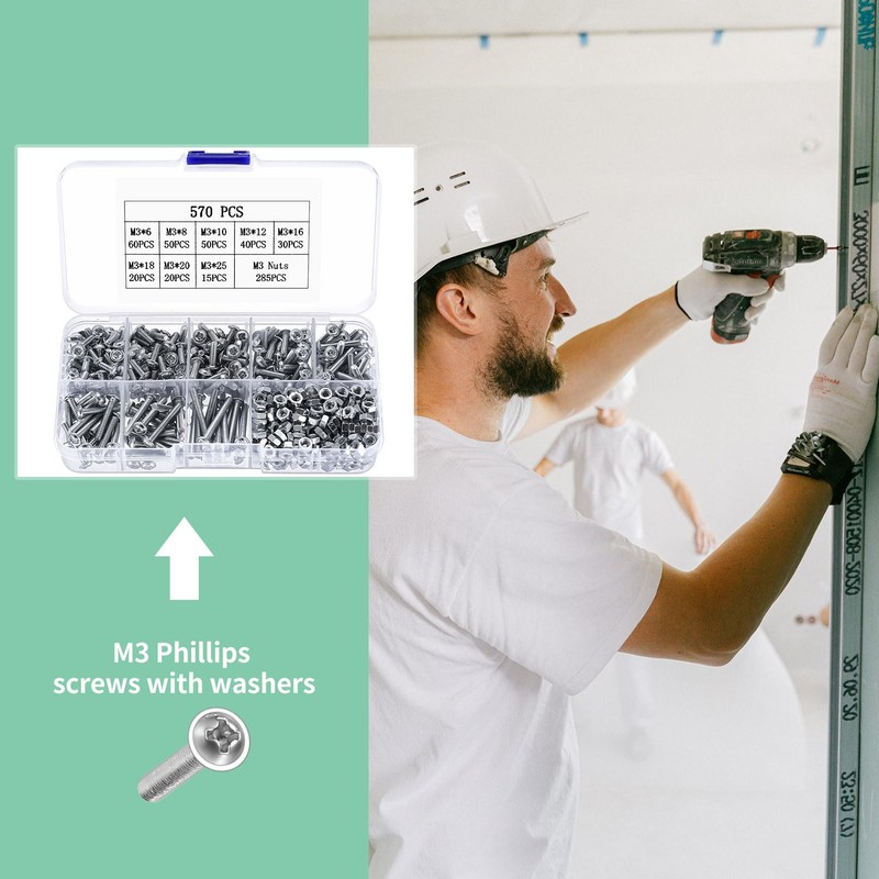 - Package Includes: 570 pcs in total, sizes and quantities include: 60 pcs m3x6mm, 50 pcs m3x8mm, 50 pcs m3x10mm, 40 pcs m3x12mm, 30 pcs m3x16mm, 20 pcs m3x18mm, 20 pcs m3x20mm, 15 pcs m3x25mm, 285 pcs m3 nuts, sufficient quantity, and rich sizes, enough for your daily use.