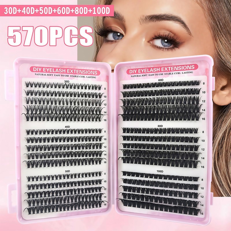 570 Pieces Cluster Lashes Kit, 30-40-50-60-80-100D DIY Lash Clusters, Fluffy Eyelash Extensions, Curly Durable Eyelash Clusters for Women (8-16mm Mix)