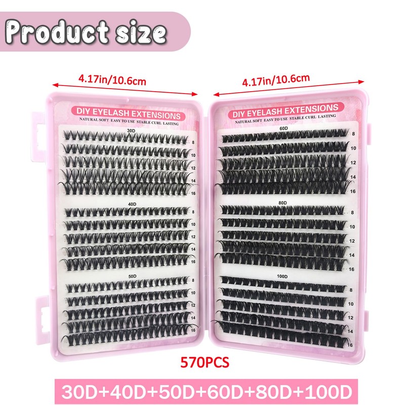- Complete Lash Set: This set includes 570pcs of high-quality cluster lashes, designed to add volume, length, and fullness to your natural lashes, providing a dramatic, fuller look.