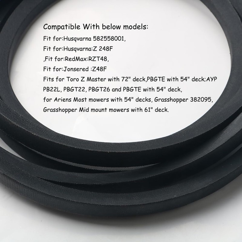 - 1.Replaces for Husqvarna 582558001,Husqvarna: Z 248F zero-turn mowers,RedMax RZT48,Jonsered Z48F Lawn Mower.Made of premium rubber;Package Included:1 pcs x Deck Belt