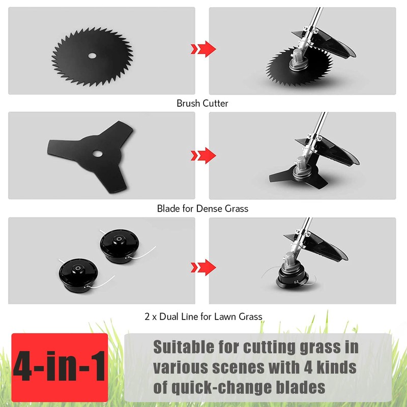 - [4 DETACHABLE TRIMMING HEADS]-- Equipped with 4 kinds of cutting heads: 2* 0.08'' dual line bump feed head, an 18.5inch 3T blade and an 18.5inch 4T circular saw blade. This 4-in-1 weed eater and brush cutter allows you to do multiple chores with one machine. Not only can trim weed and lawn grass quickly with a 10’’ cutting path, but also can cut bush, shrubs, thick grass or vegetation with an 18’’ cutting blade.